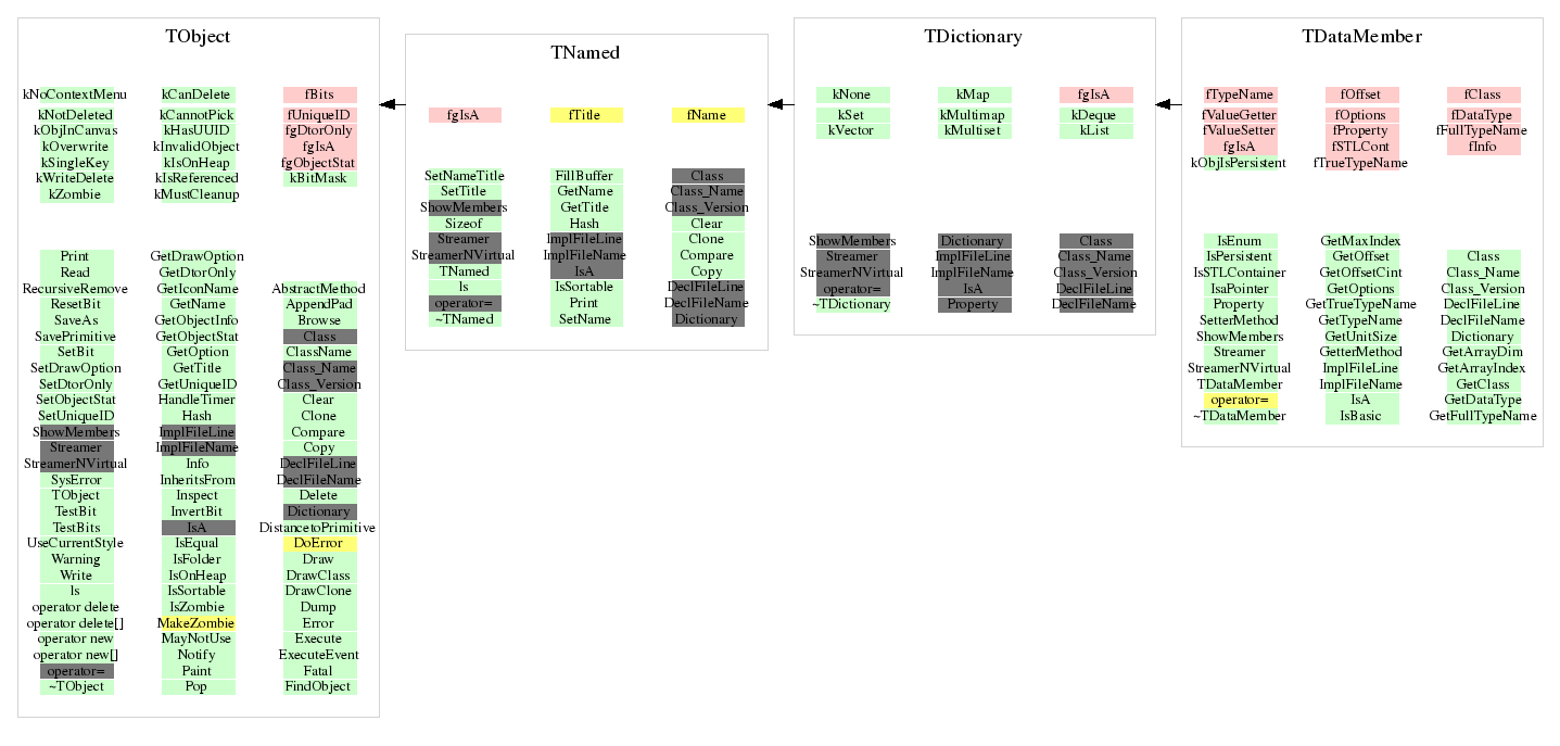 TDataMember. All ROOT classes may have RTTI (run time type identification) support added. The data is stored in so called DICTIONARY (look at TDictionary). Information about a class is stored in TClass. This information may be obtained via the CINT api - see class TCint. TClass has a list of TDataMember objects providing information about all data members of described class./*
