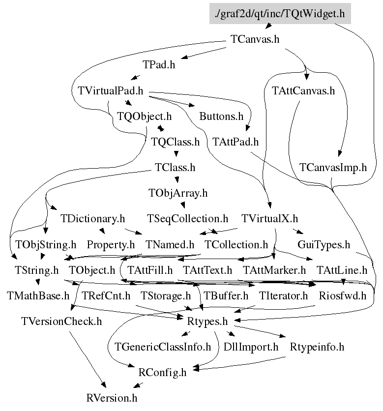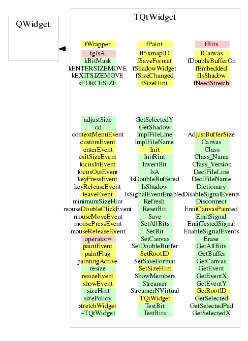 TQtWidget is a QWidget with the QPixmap double buffer It is designed to back the ROOT TCanvasImp class interface and it can be used as a regular Qt Widget to create Qt-based GUI with the embedded TCanvas objects This widget can be used as a Qt "custom widget" to build a custom GUI interfaces with Qt Designer The class emits the Qt signals and has Qt public slots Public slots: (Qt) virtual void cd(); // make the associated TCanvas the current one (shortcut to TCanvas::cd()) virtual void cd(int subpadnumber); // as above - shortcut to Canvas::cd(int subpadnumber) void Disconnect(); // disconnect the QWidget from the ROOT TCanvas (used in the class dtor) void Refresh(); // force the associated TCanvas::Update to be called virtual bool Save(const QString &fileName) const; // Save the widget image with some ppixmap file virtual bool Save(const char *fileName) const; virtual bool Save(const QString &fileName,const char *format,int quality=60) const; virtual bool Save(const char *fileName,const char *format,int quality=60) const; signals (Qt) CanvasPainted(); // Signal the TCanvas has been painted onto the screen Saved(bool ok); // Signal the TCanvas has been saved into the file RootEventProcessed(TObject *selected, unsigned int event, TCanvas *c); // Signal the Qt mouse/keyboard event has been process by ROOT // This "signal" is emitted by the enabled mouse events only. // See: EnableSignalEvents // --- DisableSignalEvents public methods: The methods below define whether the TQtWidget object emits "RootEventProcessed" Qt signals (By default no RootEventProcessed Qt signal is emitted ) void EnableSignalEvents (UInt_t f) void DisableSignalEvents(UInt_t f), where f is a bitwise OR of the mouse event flags: kMousePressEvent // TCanvas processed QEvent mousePressEvent kMouseMoveEvent // TCanvas processed QEvent mouseMoveEvent kMouseReleaseEvent // TCanvas processed QEvent mouseReleaseEvent kMouseDoubleClickEvent // TCanvas processed QEvent mouseDoubleClickEvent kKeyPressEvent // TCanvas processed QEvent keyPressEvent kEnterEvent // TCanvas processed QEvent enterEvent kLeaveEvent // TCanvas processed QEvent leaveEvent For example to create the custom responce to the mouse crossing TCanvas connect the RootEventProsecced signal with your qt slot: connect(tQtWidget,SIGNAL(RootEventProcessed(TObject *, unsigned int, TCanvas *)) ,this,SLOT(CanvasEvent(TObject *, unsigned int, TCanvas *))); . . . void qtrootexample1::CanvasEvent(TObject *obj, unsigned int event, TCanvas *) { TQtWidget *tipped = (TQtWidget *)sender(); const char *objectInfo = obj->GetObjectInfo(tipped->GetEventX(),tipped->GetEventY()); QString tipText ="You have "; if (tipped == tQtWidget1) tipText +="clicked"; else tipText +="passed"; tipText += " the object <"; tipText += obj->GetName(); tipText += "> of class "; tipText += obj->ClassName(); tipText += " : "; tipText += objectInfo; QWhatsThis::display(tipText) }