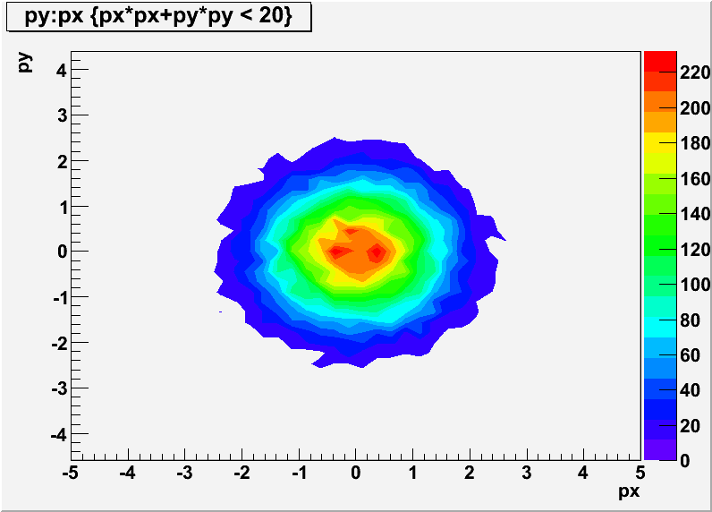 ntuple->Draw("py:px","px*px+py*py < 20", "contz,list");
